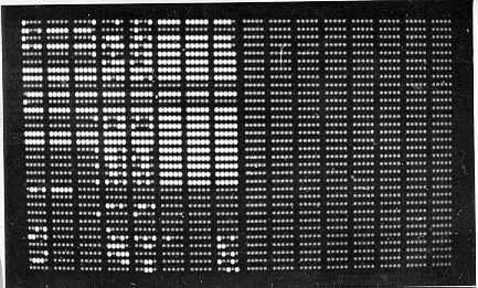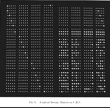 The picture above shows the display from a Display Cathode Ray Tube for a Williams-Kilburn CRT Store (from a Ferranti Mark 1). The bright spots represent 1s and the dim spots represent 0s, representing data in a binary format. Each spot corresponds to an area of electrostatic charge. The display shows 32 40-digit binary numbers with an extra 20-digit line at the top.