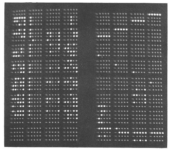 The console consisted of a large desk with a 5-hole paper tape reader (200 characters per second) and paper tape punch (15 cps) on one side, and an electric typewriter (6 cps) on the other; the much faster `golf-ball' IBM Selectric typewriter was still in the future. In between was a console with four 3-inch CRTs displaying the contents of the accumulator, the two registers and the eight counters, and two 6-inch CRTs into which contents of any two of the eight storage tubes could be copied for observation -- or manipulation by hand! These displays consisted of two columns of 32 20-bit strings, together with one extra 20-bit string to tell you which tube you were seeing; these strings were subdivided into 4 x 4 blocks for easy viewing -- see Figure 1 in which the bright dots are ones and the feint ones are zeros.5 Each of the 5-bit sub-strings was named after the corresponding teleprint character of the 5-hole tape, except for the teleprint control characters e.g. carriage return, etc., to which non-alphabet symbols were assigned. The use of the teleprint code to represent the numbers 0-31, and in which to write algorithms was much reviled by some programmers,6a but I can still recite it by heart,