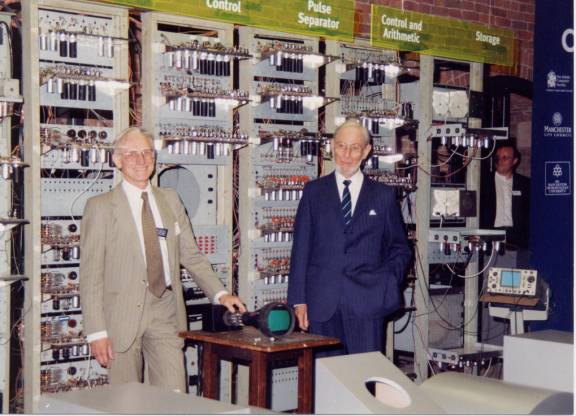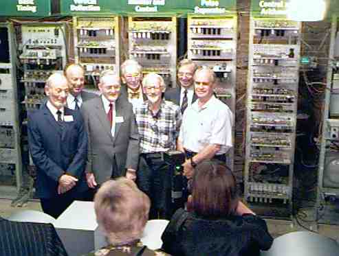 This shows an enhanced Manchester Mark 1 team standing in front of the Replica in the 1830 Warehouse: Left to Right: G.C. (Geoff) Tootill, D.B.G. (Dai) Edwards, Tom Kilburn, Laurie Allard, A.A. (Alec) Robinson, J.C. (Cliff) West, and G.E. ("Tommy") Thomas.