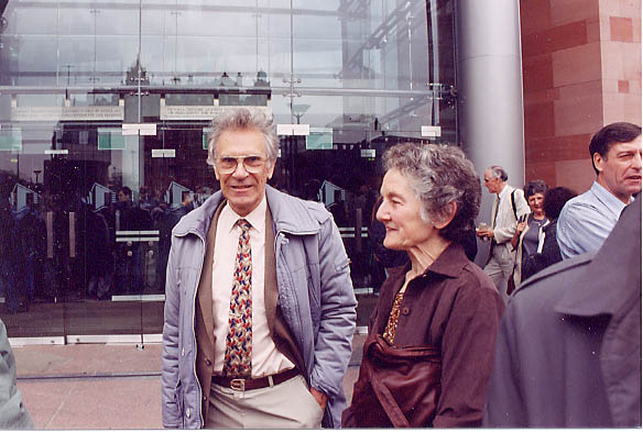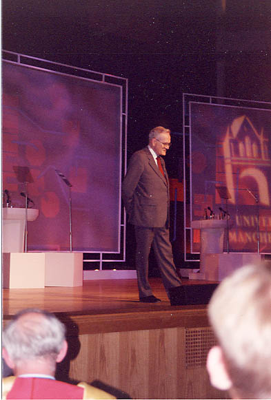 Tom Kilburn and Lady Williams (F.C.'s widow) press a button to formally "Switch On" the Replica Baby over the Satellite Link. The Baby responds immediately with a pattern of "1"s spelling out