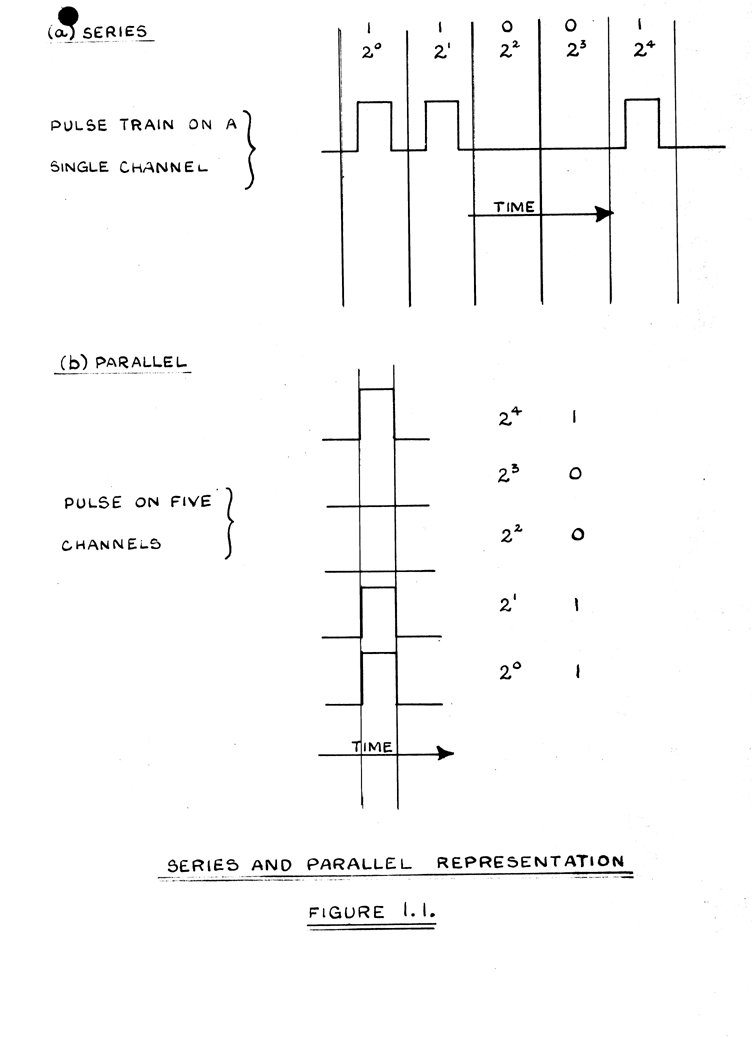 If a piece of information (a number, say) is represented by k digits, the electronic quantities, corresponding with the digits, may exist either sequentially on one channel, one of k time periods being assigned to each digit, or simultaneously on k channels, one channel being assigned to each digit. The two methods of operation, which are called 'series' and 'parallel', respectively, are shown at (a) and (b) in Figure 1.1., the binary equivalent of the number 19 being used as an example. In this figure video pulses are used for digital representation, and at (a) the least significant figure is placed on the left, so that time can be shown increasing from left to right in the conventional manner.