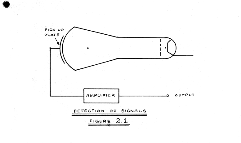 The charge distributions corresponding with digits exist on small areas of the C.R.T. screen, and are arranged in the form of a two dimensional array. This array is produced by a television type of raster, in which the digits of a line, and the lines of the raster, are scanned sequentially. A typical display is shown in photograph 1. A 'signal' or 'pickup' plate, consisting of a sheet of metal foil, or gauze, external to the C.R.T. is closely attached to the face of the C.R.T. (see Figure 2.1.). Each area of the screen is therefore capacity coupled into a common channel, as in the iconoscope. This method of detecting changes of charge on an insulating surface has also been used to determine the secondary emission ratio of insulators using pulse technique (bibliography 4).