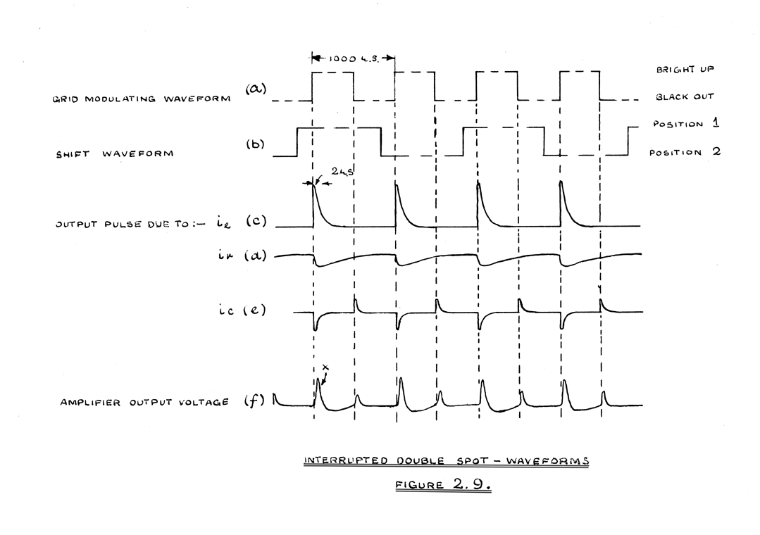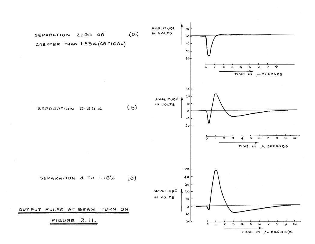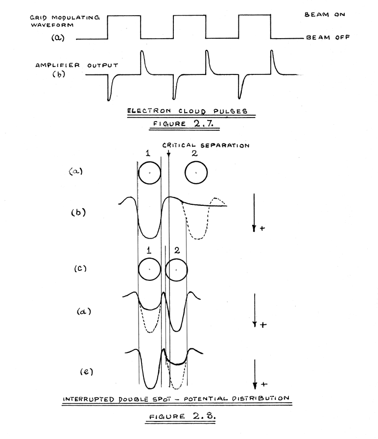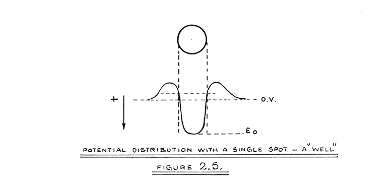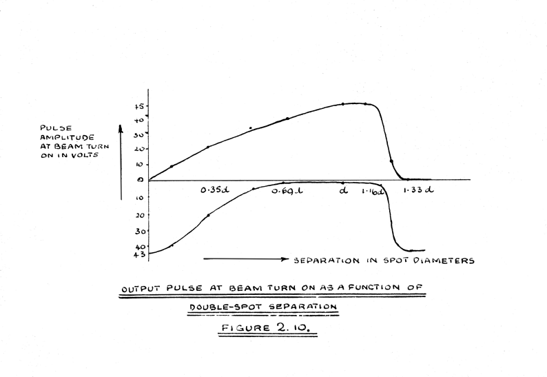 An estimate of the speed at which some decrease in amplitude may be expected, can be derived from the double spot experiment. From Figure 2.10, the limits of the separation, between which maximum refilling of the adjacent well occurs, are seen to be d and 1.16d. From Figure 2.11(c), refilling of the adjacent well is seen to be almost complete in 4 microseconds at the operative value of beam current. If, therefore, the diameter of the spot is 1mm. and the spot travels at speeds greater than 0.04mms/µsec. some loss of positive pulse amplitude is expected.