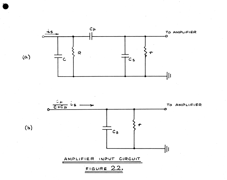 The voltage level of the video signals is increased by connecting the pickup plate to the input of a suitable amplifier, as shown in Figure 2.1. The equivalent input circuit of the amplifier is shown in Figure 2.2.(a) where is represents the signal current due to electrons arriving at and leaving the screen surface; Cp, the capacity of the bombarded area of the screen to the pickup plate; C, the capacity of the bombarded area other than that to the pickup plate; Cs, the remaining stray capacities to earth; r, the input impedance of the amplifier; and R, the ohmic resistance due to the fact that the screen material is not a perfect insulator. The leakage time constant (Cp + C)R is known to be of the order of 0.5 seconds, while very approximate values for (Cp + C) and R are 0.005 µµf and 108 megohms respectively. The time constant Csr is less than 0.1 microsecond and r is approximately 1000 ohms. Since R>>r, the signal voltage developed across r is substantially unaffected by R, which is therefore neglected. The pickup plate current appropriate to is and flowing through Cp is very nearly (Cp/(C + Cp)) is, so that the input circuit may be reduced to that shown in Figure 2.2.(b), the final signal voltage being (Cp/(C + Cp)) ris. The amplifier, which is fully described in Section 8.1. has a bandwidth of 2 megacycles, and may be regarded as a resistance of 100 MΩ. The voltage output from the amplifier is, then, 1 volt per hundredth of a micro-amp of current flowing to, or from, the pick-up plate. There is no phase reversal in the amplifier, and current flowing from the pick-up plate gives a positive output voltage, and vice versa.