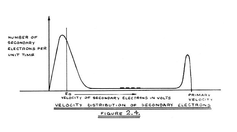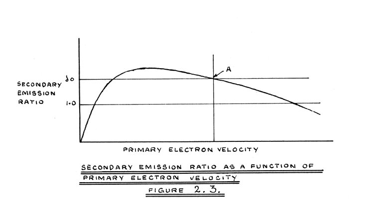 In a C.R.T. which has its deflector plates, carbon coating, and first and third anodes all connected to earth potential, and its grid, cathode and focus electrodes connected in a normal manner with respect to a negative potential (say -2000 volts), the inner surface of the screen will also be at earth potential, because it is in contact with the carbon coating. This assumes that no beam current has been present for some period of time, probably of the order of a few seconds. Now in the types of commercial C.R.T. investigated (CV1097 and CV1131), the relation between secondary emission ratio of the screen material and primary electron velocity is of the form shown in Figure 2.3. (bibliography 5). At points of operation such as A, the secondary omission ratio δo is greater than unity. This is true for all primary velocities in the range 1000 volts to 3000 volts at least. It follows that if operating under such conditions, the electron beam is switched on and falls steadily on a single spot on the C.R.T. screen, the number of secondary electrons leaving the spot and moving towards the electrode assembly, will exceed the number of primary electrons arriving at the spot. The resulting net loss of negative charge causes the potential of the bombarded spot to become positive, and its potential is then greater than that of any electrode in the tube. Later secondary electrons will therefore be ejected into a retarding electric field, and those which have emission velocities below that corresponding with the potential of the spot, will be returned to the screen. The electrons with low emission velocities will, in fact, return to the spot; those with higher velocities, repelled by other electrons, will have time to acquire an additional component of velocity parallel to the screen surface and will return to the immediate vicinity of the spot. Experiments indicate that, for times of bombardment less than 400 micro-seconds, the screen is substantially unaffected at distances greater than a spot diameter from the centre of the spot. If the effective secondary current is defined as that caused by secondary electrons which leave the spot, and are not returned to it by the retarding field, the effect of the retarding field will be to reduce the effective secondary emission ratio δ. The potential of the spot will, in fact, rise to a value Eo, thought to be about three volts, such that the retarding field causes the effective secondary emission ratio to be unity. Eo can be understood in terms of the velocity distribution of the secondary electrons (bibliography 6), indicated in Figure 2.4. (this type of distribution is known to exist in the case of metals; the distribution for insulators is not necessarily of the same type) as that point to the right of which the number of secondary electrons per unit time equals the primary current Ip. The potential of the spot will now remain constant at Eo but the longer the spot is bombarded the larger is the affected area around it. The potential distribution on the screen is summarised in Figure 2.5. in which increasing positive potential is plotted in the direction of the arrow, so that, using the analogy of gravitational field, electrons may be said to "fall" towards regions of positive potential. The depression in the distribution has been termed a "well".