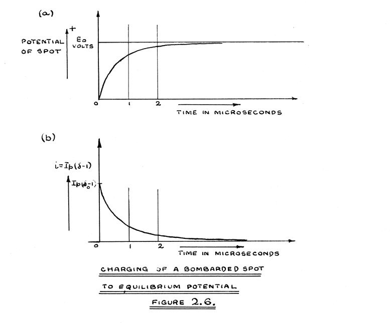 The time taken to establish the potential Eo depends on the capacity per unit area of the screen, the current density of the beam, the secondary emission ratio and the velocity distribution of the secondary electrons. It follows that, with a given C.R.T., the time taken is inversely proportional to the current density. Defocussing at constant beam current, to double the spot diameter, will increase the time scale by four, whilst doubling the beam current, with constant spot size will halve the time scale. The spot capacity appears to be charged exponentially towards Eo as shown in Figure 2.6.(a), and the electron beam may be regarded as an ohmic resistance to the first order of approximation, the time constant so formed being of the order of one microsecond or less.
