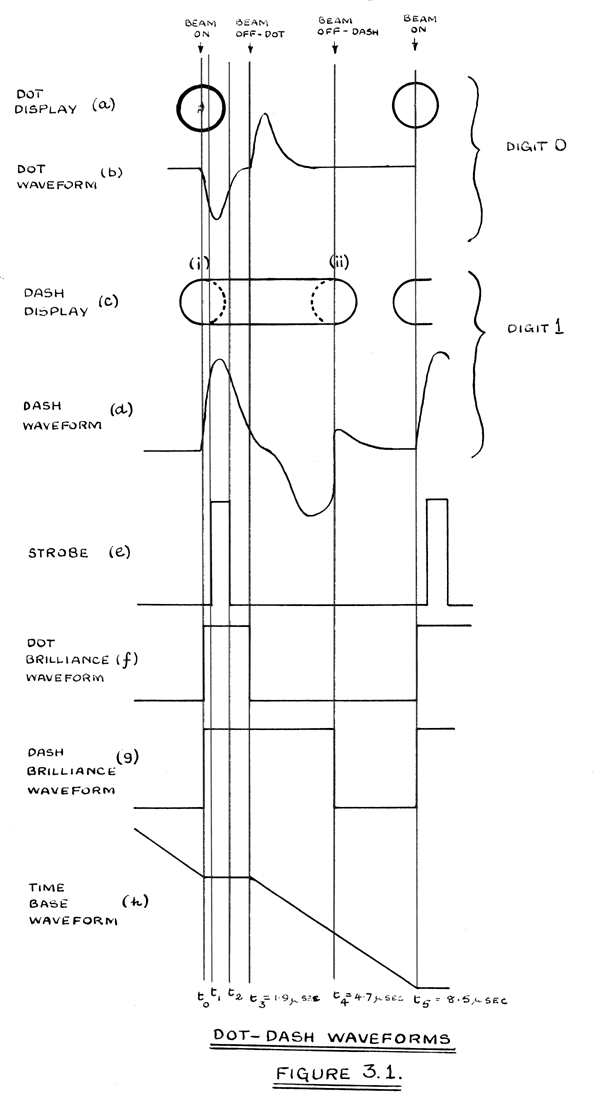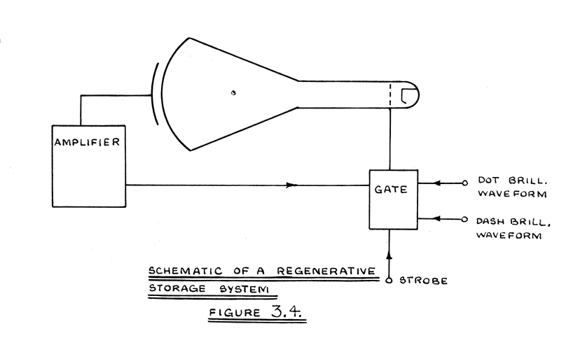A convenient method of writing information into the storage unit is to apply the information, in the form of negative pulses, to the cathode of a diode D8, the anode of which is connected to the grid of V2. Each negative pulse, timed with a bright up instant, will extend a dot into a dash. When writing new information over old information, it will also be necessary to convert a dash into a dot. This will be achieved by applying a waveform, derived from the direction control to the suppressor grid of V1, such that anode current does not flow during write periods. This will break the regenerative loop, and allow completely new information to be inserted via D8.