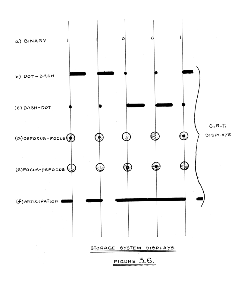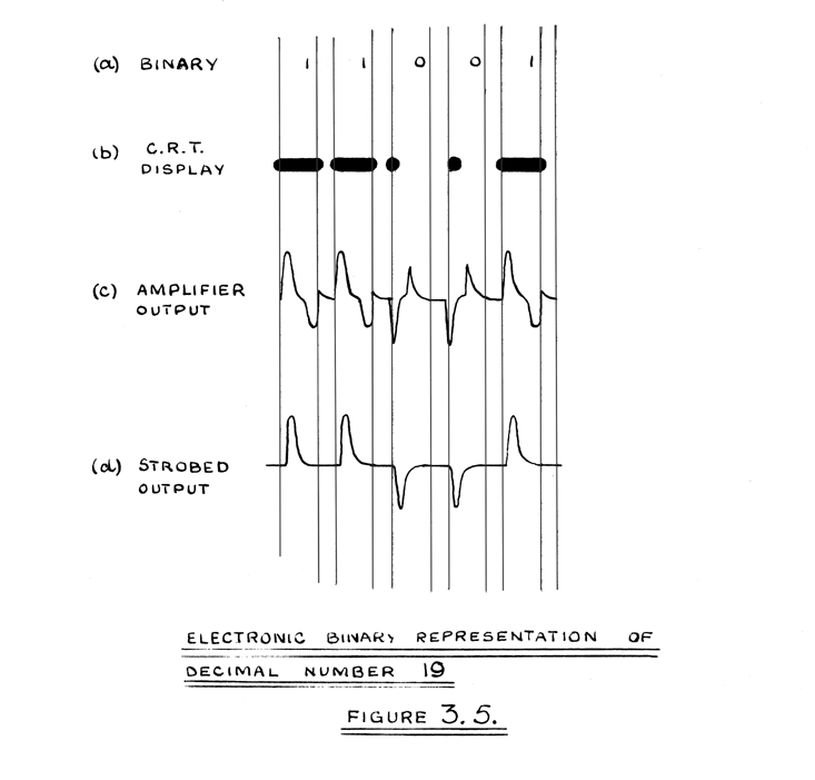 In the binary system only two values are possible for 'a', so that any two state electronic device may be used to represent a binary digit. Examples of such devices are a variety of flip-flop circuits, the difference in level of two D.C. or A.C. voltages, the presence or absence of a video or r.f. pulse, and the device described in this paper, namely the presence or absence of a stored charge on the inner surface of a cathode ray tube screen. As a digit is moved to different parts of the machine, its representation will change, so that at one time or another during a computation it will have adopted several of these possible forms.