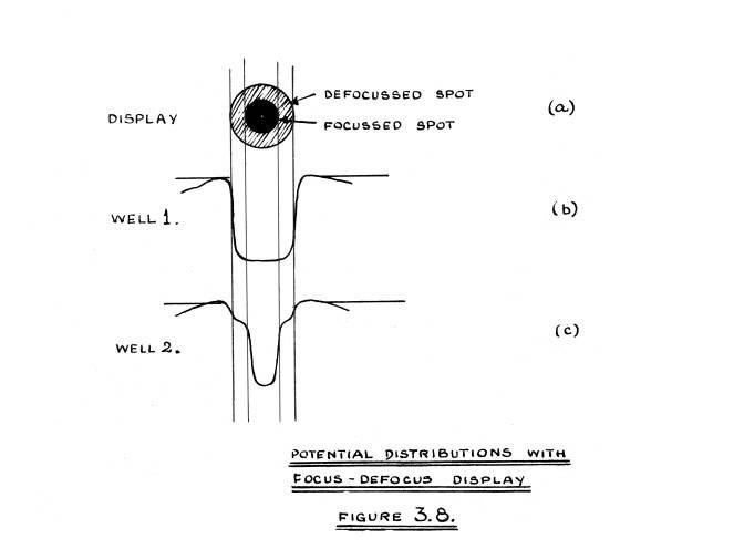 Since a small amount of mutual interference between adjacent charged areas is allowed to occur, the time of bombardment of the areas becomes important, particularly when this time is only of the order of 1 microsecond. (The time of bombardment of the areas is determined by the velocity with which the spot travels across the C.R.T. screen. This velocity is discussed in the next section.) From Figure 2.11. it can be seen that in the double spot experiment bombardment times less than 2 microseconds would produce little filling of the adjacent well. If, then, some areas of the raster are scanned more frequently than others, more mutual interference will occur in these regions. This will happen when the store is part of a computing machine and it is necessary to read or write into the store frequently during one raster period, for under these circumstances certain lines of the raster will be scanned more often than other lines. With a 32 line raster, and the method of raster generation described in Section 4, it is never possible to scan a particular line more than 33 times as often as the adjacent lines. For in one raster period this line would be scanned once during a scan period, and 32 times during action periods at most.