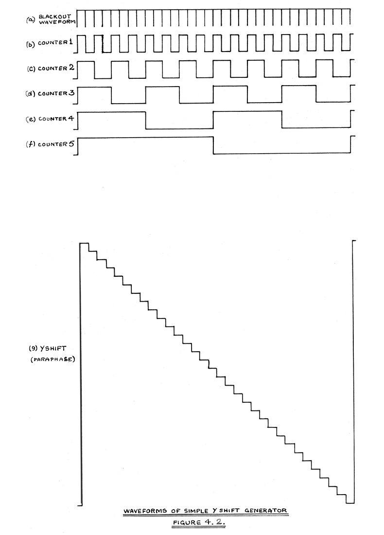 To summarise, the circuit causes a scan of a 32 line raster to be performed, and the action line of the raster can be selected by a suitable choice of the positions of five switches. In the final machine these switches will be replaced by five leads via which either a positive or a zero pulse may be fed to the flip-flops. If a familiar case is considered, in which the instruction is to read line 19, positive pulses (1's) will be sent to flip-flops 1, 2, and 5 only. At the beginning of each scan period, all the flip-flops will be set into a standard condition by the negative pulses shown at (o) in Figure 4.5. The five flip-flops form a staticisor. It should be noted at this point that, although the Y raster generator, X time base generator, and the circuits generating such waveforms as the strobe for the amplifier output, are essential to the operation of a single storage unit, these circuits are common to all further units. It is only necessary to repeat the C.R.T., amplifier and gate circuit, since all the C.R.T.'s and gate circuits are operated in parallel, as explained in Section 6. For this reason, a C.R.T. and its associated amplifier and gate circuit will be called a 'storage unit'.