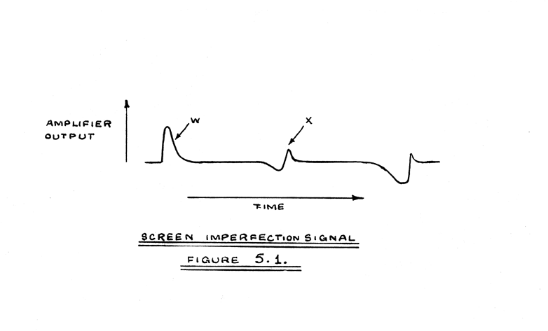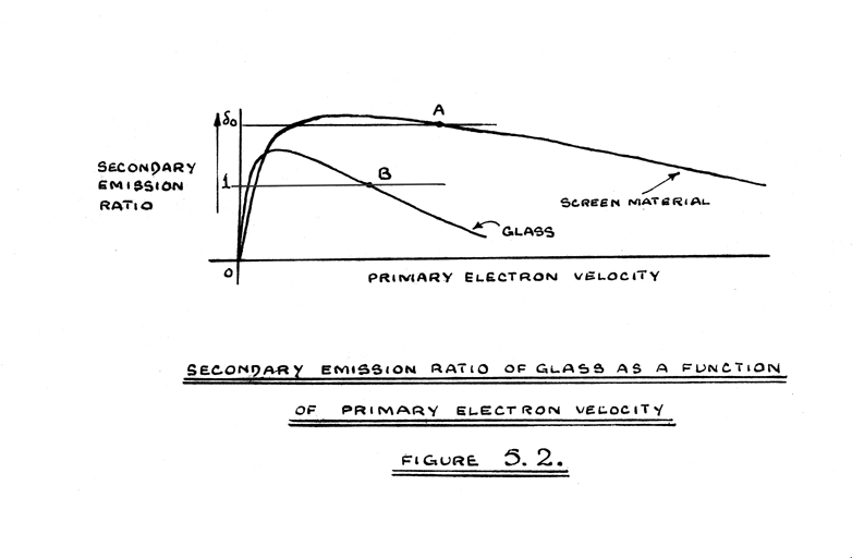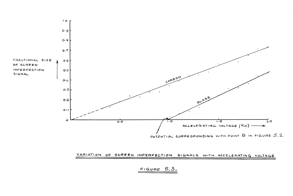 The signal output from the amplifier normally produced by scanning a line on the C.R.T. screen is shown in Figure 3.2.(e). However, if the line is moved to some positions on the screen the output is as shown in Figure 5.1. Disturbances of the type shown at X are thought to be caused by the following imperfections in the screen. Firstly, the screen may contain small particles of carbon, which have a secondary emission ratio less than unity for all primary electron velocities. When such particles are subjected to electron bombardment they will receive more electrons from the primary beam than they lose by secondary emission. The particle will therefore accumulate negative charge, and it will continue to do so until its potential is approximately cathode potential. Secondly, as can be seen by the naked eye, the screen material is perforated at several points. The operative screen material at these points is glass, which, as indicated in Figure 5.2., has a much lower inversion point B (about 1000 volts) than that of the true screen material. At operating voltages above that corresponding with the point B, the glass will therefore have a secondary emission ratio less than unity. The very small areas of glass uncovered by the perforations of the screen material will therefore, under electron bombardment, accumulate electrons until they are reduced to the potential corresponding with the point B.