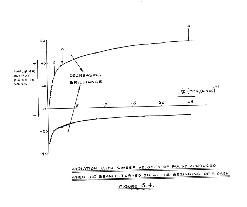 As the speed is increased the pulse obtained when the beam is turned on at the beginning of a dash changes from a positive pulse to a negative pulse via stages similar to those shown at (c), (b) and (a) in Figure 2.11. Figure 5.4. (bibliography 8) in which both positive and negative amplitudes are plotted, indicates the change in the amplitude of the pulse as a function of the reciprocal of the speed with which the electron beam moves across the C.R.T. screen. The point A corresponds with the speed estimated above. If the speed is increased by a factor of ten, approximately, the point B is obtained. This is the operating point used at present and it corresponds with 8.5 microseconds and 3.1mms. per digit. If the speed is increased by a further factor of ten (4mms/µsec.), the positive pulse ceases to exist, and the output pulse is the negative pulse due to the electron cloud effect. It is, of course, impossible to operate the storage system at this last speed because the pulse obtained when the beam is turned on will always be negative independent of whether a dot or a dash is being read. However, it may prove possible to operate the system at some point between B and C, the speed corresponding with C being twice the present speed.