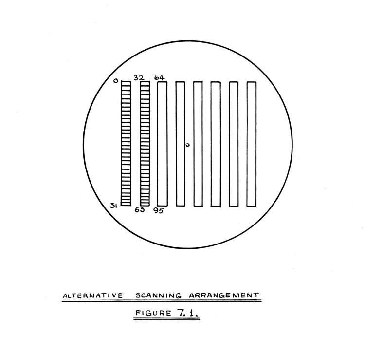 The scanning system so far described is most suitable for series machines in which one complete word is stored on each line. Machines designed for the parallel mode of operation require all the digits of a word to be simultaneously available on different wires. Working on a basis of 32 digits per word, 32 C.R.T.'s might be used, one digit of each word occupying one space on each C.R.T. With this arrangement, the digits occupying the 32nd space in each line would not be available for 272 microsecs. This time can be reduced by splitting the scan into 8 columns of short lines, each containing 4 digits, as shown in Figure 7.1., arrangements being made to read any digit in any line at any time. This would reduce the time to obtain any digit to 34 microsecs.
