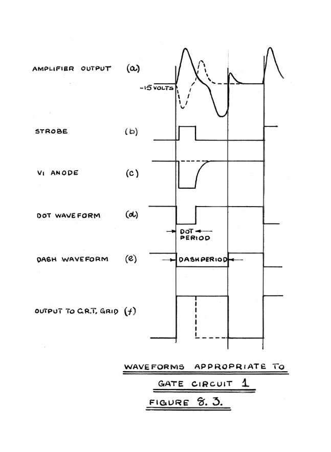 With zero or positive pulse input from the amplifier, the control grid of V1 is at earth potential, and its anode is bottomed. The resistance chain connected to this anode is such that V2 is then cut off, and its anode is caught at a potential of 80 volts by D6. With the dash waveform applied to the anode of D4, the anode of V2 will be alternately caught by D6 and bottomed, producing a dash display. The circuit to the right of the anode of V2 is the same as in gate circuit 1. The operation of D5 is immaterial at this stage since a dash period overlaps a dot period.