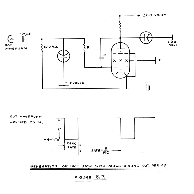 The sweep required for dot-dash storage, shown at (h) in Figure 3.1. pauses during the dot period. This is achieved by returning the time base grid leak to the dot waveform and D.C. restoring the waveform with an inverted diode to a potential equal to the mean grid potential during the sweep (Figure 8.7.). During the dot period, no current flows in R and the rate of sweep is therefore zero. If E is the amplitude of the dot waveform, the rate of sweep at all other times is E/RC.