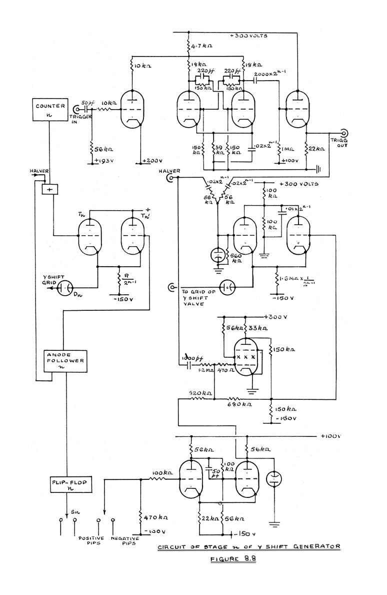 Stage n, of the schematic diagram of the Y-shift generator shown in Figure 4.4., is reproduced on the left of Figure 8.8. Details of the units are shown in corresponding positions on the right of the figure.