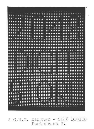 As shown in photograph 2, 2,048 digits have been stored, the area occupied on the storage tube being 154 sq. cms. (11cms. x 14cms.). In photograph 1, the area occupied by 1,024 digits is 64 sq. cms. (10cms. x 6.4cms.). The deterioration in the uniformity of focus over the larger area can be seen by the fact that for satisfactory operation - negligible interference between digit areas - the area occupied by 2,048 digits is more than twice that occupied by 1,024 digits.