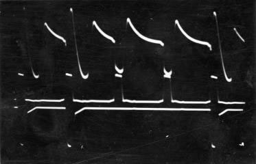 If the input to the gate circuit from the amplifier is connected to earth potential for a period longer than a raster period, then the store will be filled (dashes everywhere), for the control grid of V1 will be turned on during every strobe period. If, on the other hand, the output of the amplifier is disconnected from the gate circuit for a period longer than a raster period, the store will be emptied.